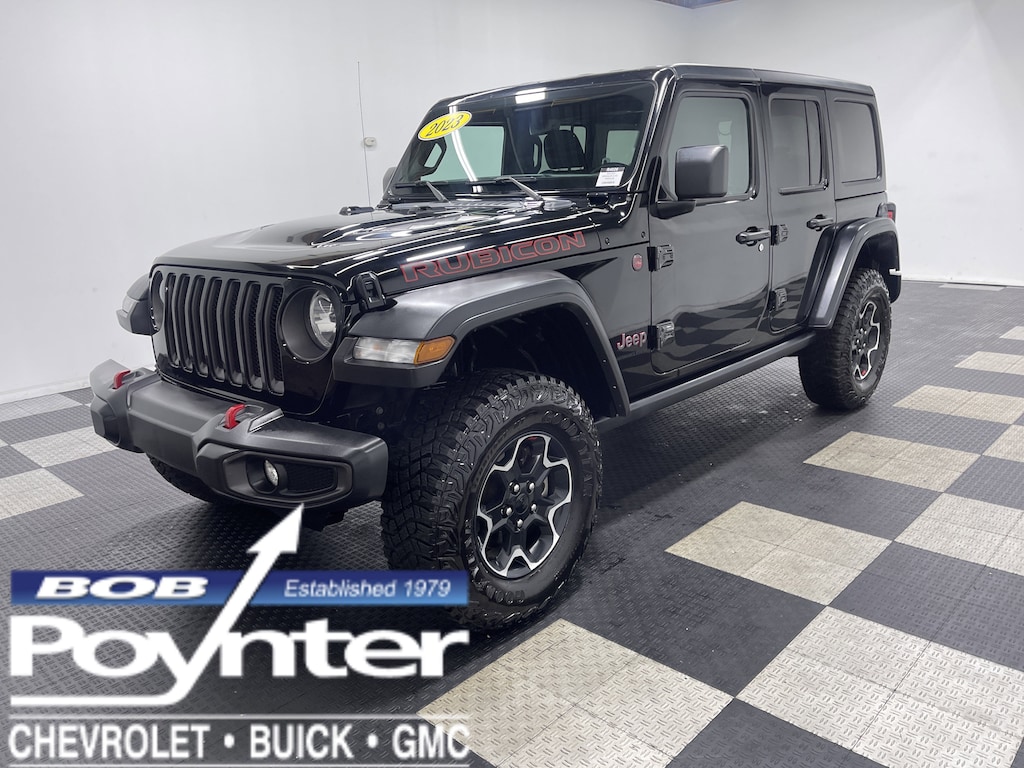 Check out this 2023 Jeep Wrangler Rubicon. Its Automatic transmission and Intercooled Turbo Premium Unleaded I-4 2.0 L/122 engine will keep you going. This Jeep Wrangler has the following options: TIRES: LT285/70R17C BSW OFF-ROAD (STD), PERFORMANCE SUSPENSION (STD), GVWR: 5,800 LBS (STD), FRONT LICENSE PLATE BRACKET, ENGINE: 2.0L I4 DOHC DI TURBO W/ESS, BLACK, PREMIUM CLOTH LOW-BACK BUCKET SEATS, BLACK CLEARCOAT, BLACK 3-PIECE HARD TOP -inc: Freedom Panel Storage Bag, Rear Window Defroster, Rear Window Wiper/Washer, No Soft Top, 4.10 REAR AXLE RATIO (STD), and Wheels: 17" x 7.5" Machined/Painted Black. Test drive this vehicle at Bob Poynter GM, 1209 E Tipton St, Seymour, IN 47274.