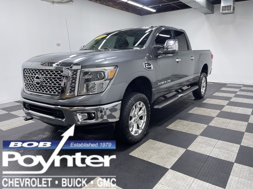 Look at this 2016 Nissan Titan XD SL. Its Automatic transmission and Intercooled Turbo Diesel V-8 5.0 L/305 engine will keep you going. This Nissan Titan XD comes equipped with these options: GUN METALLIC, BLACK, LEATHER SEAT TRIM, [Z66] ACTIVATION DISCLAIMER, [M11] REAR SEAT STORAGE COMPARTMENT -inc: With luggage floor, [B11] RUNNING BOARDS, Wireless Phone Connectivity, Wheels: 20" x 7.5" Painted Alloy, Valet Function, Urethane Gear Shifter Material, and Transmission: Aisin 6-Speed Automatic. See it for yourself at Bob Poynter GM, 1209 E Tipton St, Seymour, IN 47274.